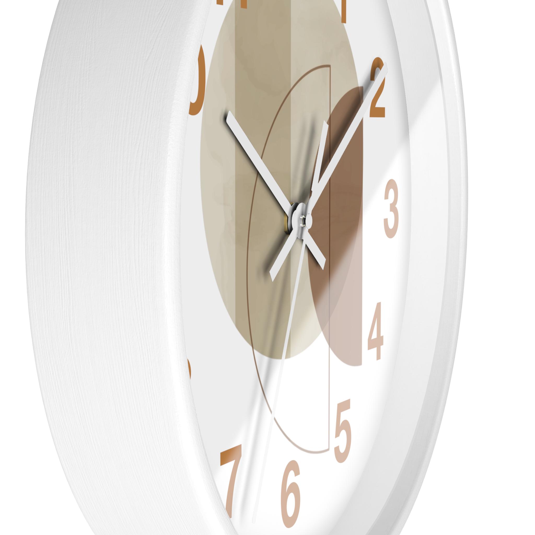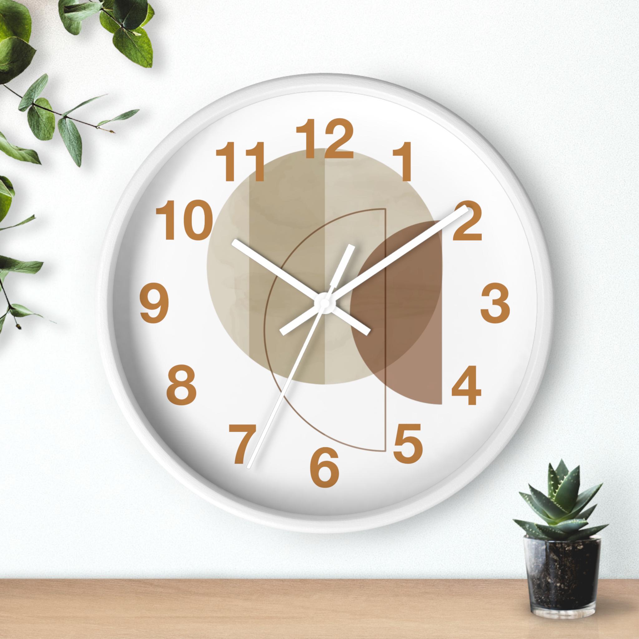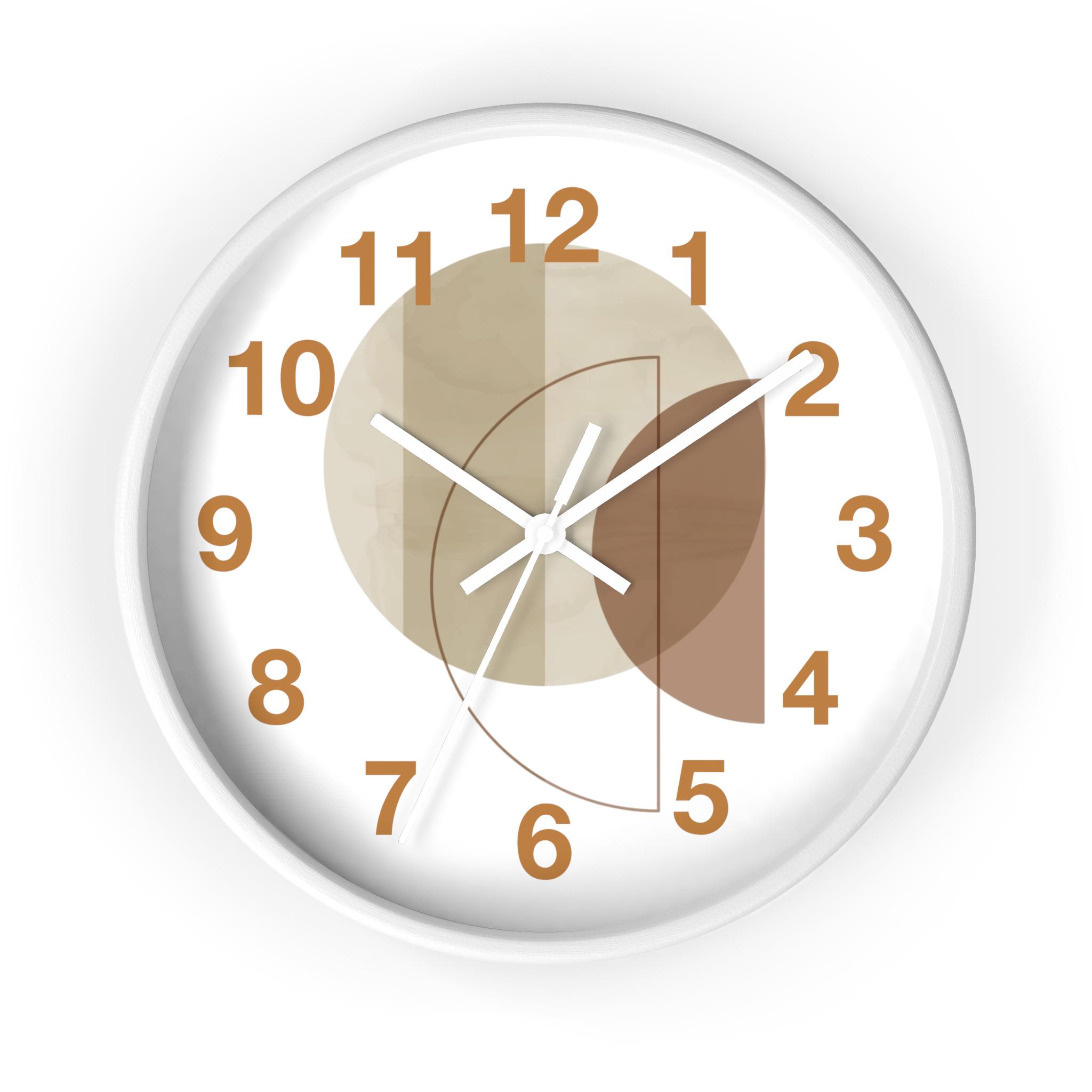 This stylish wall clock features a soft, neutral color palette and a modern geometric design, adding a touch of sophisticated elegance to any room. Overlapping geometric patterns in beige, tan, and warm brown create a tranquil and minimalist atmosphere, complementing modern, Scandinavian, and natural interior design. A clean white frame and striking caramel numerals give the clock a fresh, modern feel, while crisp white hands enhance readability.